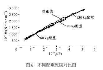 圖6 為60 、90 和130 kg 配重實驗結(jié)果與理論公式計算所得流阻的對比曲線。該曲線顯示,實驗結(jié)果與公式計算結(jié)果吻合得很好。同時,可以看出,隨著配重的增加,步升開始所需壓力逐漸增大,步升前充壓時間逐漸變長,流阻對應的壓力范圍隨之逐漸增大。
