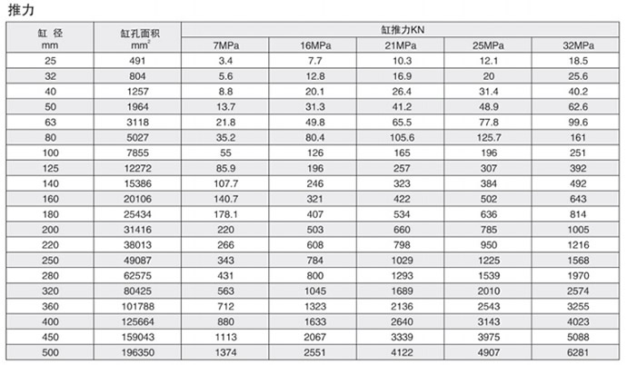 如果活塞桿受壓,則使用下面的推力表:找出最接近需要的工作壓力:在同一欄里,找出移動(dòng)該負(fù)載所需的力;在同一行里,找出所需的缸徑。
