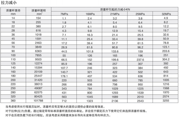 如果活塞桿受拉,則使用拉力減小表:按上述用于推用途的程序;使用下面的拉力減小表,根據(jù)所選的活塞桿徑和壓力確定所指示的力;從原來的推力中扣出此力,所得到的數(shù)值為可用來移動(dòng)負(fù)載的凈力。