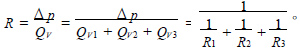 回路流量與各個泄漏流量的關(guān)系為QV =QV1 + QV2 + QV3 ,總的流阻與各泄漏回路支路流阻之間的關(guān)系為