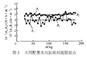 在控制棒水壓驅(qū)動機構(gòu)單缸步進性能實驗[7 ] 中,從開始充壓到水壓缸內(nèi)套動作這一段時間定義為步升前充壓時間,在此段時間內(nèi),由于水壓缸內(nèi)套未動作,回路中入缸流量等于泄漏流量,利用不同配重步升過程中的實驗數(shù)據(jù)即可求出水壓缸活塞環(huán)密封的泄漏流阻。用最小二乘法來擬合不同配重步升前充壓時間內(nèi)的( R ,Δp) , 自變量為Δp , 函數(shù)為R = Δp/QV ,求出各個配重下的流阻擬合公式, 即不同配重實驗所對應的b0 和b1 值, 擬合結(jié)果示于圖5 , 其中, M 為配重??梢钥闯?對幾何結(jié)構(gòu)一定的活塞環(huán)密封結(jié)構(gòu)而言,不同配重實驗所對應的b0 和b1 值基本不變。取它們的平均值, B0 和B1 為計算公式中的系數(shù)。