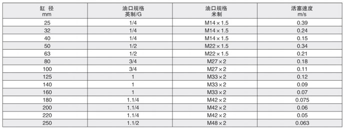 影響液壓缸速度的因素之一是引入或排出油口連接管路中的油液流量。連接管路中的油液流速應(yīng)限制與5m/s,以便把油液紊流、壓力損失和液壓沖擊減至最小。下表數(shù)據(jù)為油液流速5m/s時(shí)的活塞速度。如果超過此范圍請(qǐng)加大油口規(guī)格和連接管路。